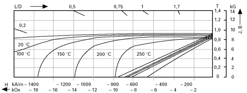 For example: a round magnet 10 Ø x 5 mm is to be made from DeltaMagnet SmCo5 code number 160/120. With an L/D-ratio of 0.5 the magnet can be used up to 200 °C. If the magnet is to be used at around 250 °C, the length must be at least 7.5 mm (L/Dratio 0.75 / see also "Magnet design").